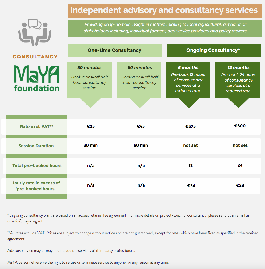 *Ongoing consultancy plans are based on an access retainer fee agreement. For more details on project-specific consultancy, please send us an email us on support@maya.org.mt